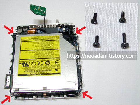2-1. 이제 나사를 분리한다. 화살표대로 총 4개가 있으며 사진 오른쪽 위에서 보듯이 나사 하나가 길이가 다르니 이것만 잘 기억해두면 된다.(오른쪽 아래에 들어갈 나사)