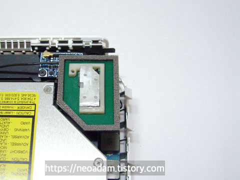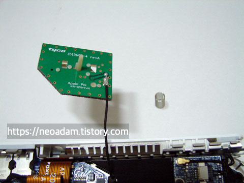 1-0. 먼저 나사를 풀어야 하는데, 그 전에 사진에서 오른쪽 위에 있는 스프링이 달린 단자(에어포트 안테나, 녹색)를 분리해야 한다. 에어포트 안테나 아래에 풀어야 할 나사가 숨어 있기 때문이다. 동영상을 보면서 어떻게 분해할지 애매하게 나와 있는 부분인데 아래 사진처럼 해주면 된다.