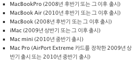 Lion을 설치해도 에어드롭이 활성화되지 않는 경우가 있습니다. 애플의 설명에 의하면 이 기능을 사용할 수 있는 기종은 아래처럼 어느 정도 최신 기종에 속합니다.