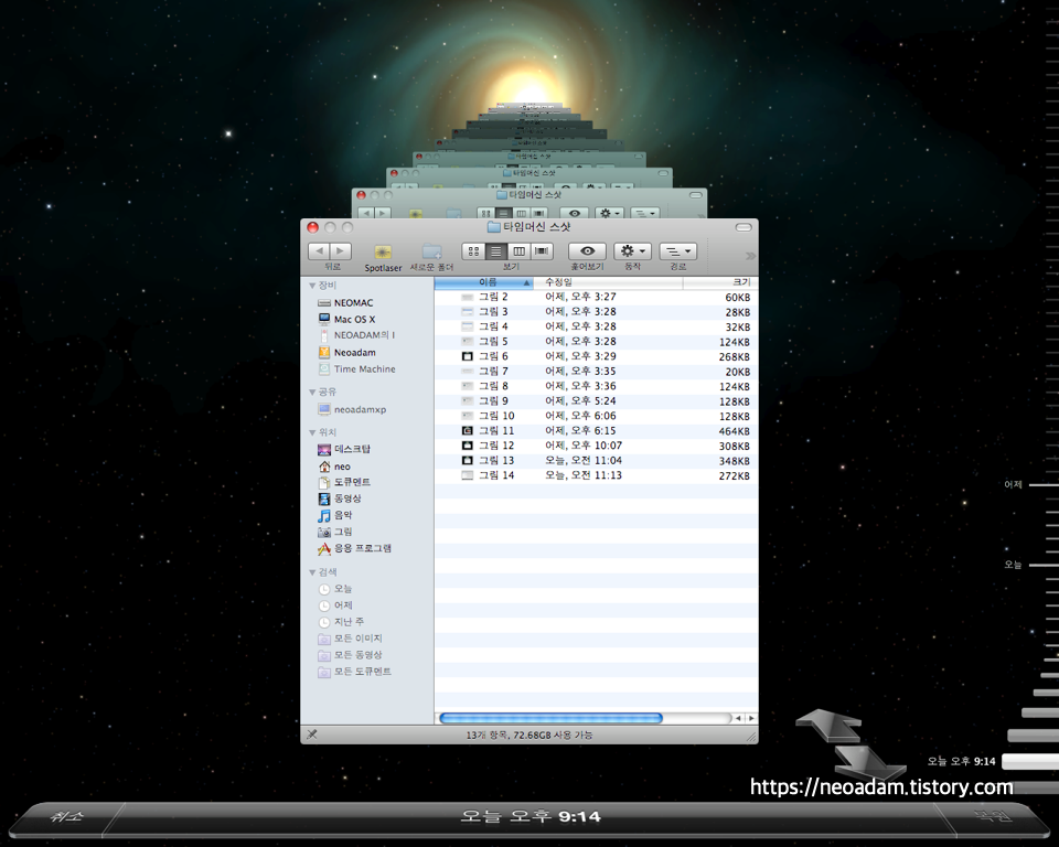 Dock에서 타임머신 아이콘을 클릭합니다. (또는 상태 표시줄에 있는 타임머신 아이콘 클릭 → 타임머신 실행) 실행하면 타임머신으로 전환되면서 파인더들이 줄지어 나타납니다.