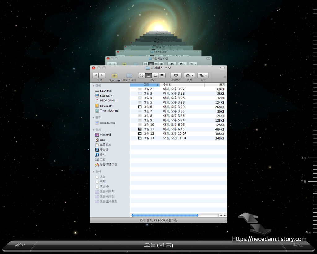 옵션 버튼을 눌러주면 위에서 설명했듯이 백업에서 제외할 폴더를 정할 수 있습니다. 이렇게 최초 백업이 진행되고, 정기적으로 백업이 된 뒤 타임머신을 실행하면 아래와 같은 화면을 볼 수 있습니다.