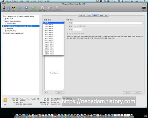 오른쪽에서 외장하드를 선택한 다음에 디스크 파티션을 나눕니다.