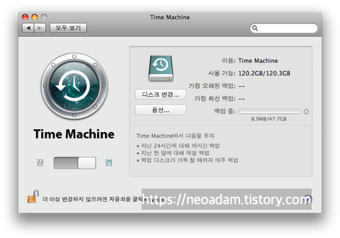 지정하면 타임머신 아이콘으로 바뀝니다. 이렇게 디스크를 지정해주면 백업이 시작됩니다.