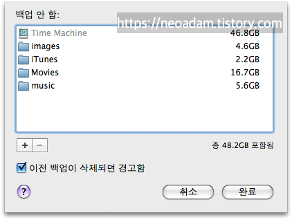디스크에 대용량 파일이 있는 경우에 시간이 많이 걸리거나 타임머신용 백업디스크의 용량이 많이 필요할 수 있는데, 이런 경우에는 백업하지 않을 드라이브나 폴더를 선택하는 옵션에서 제외시킵니다.
