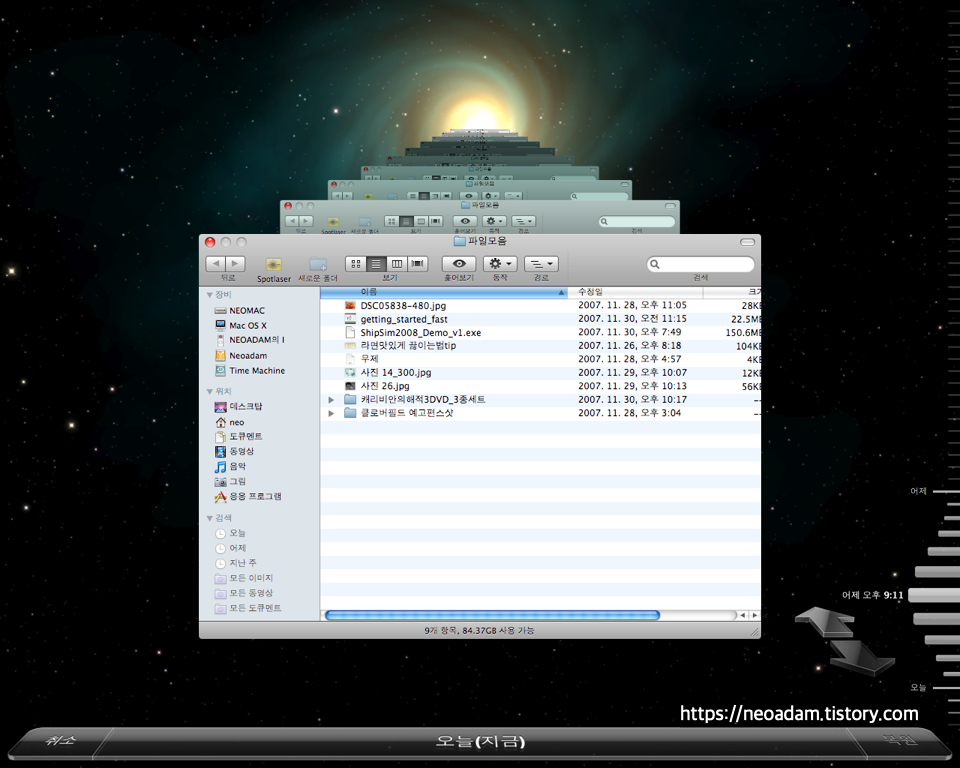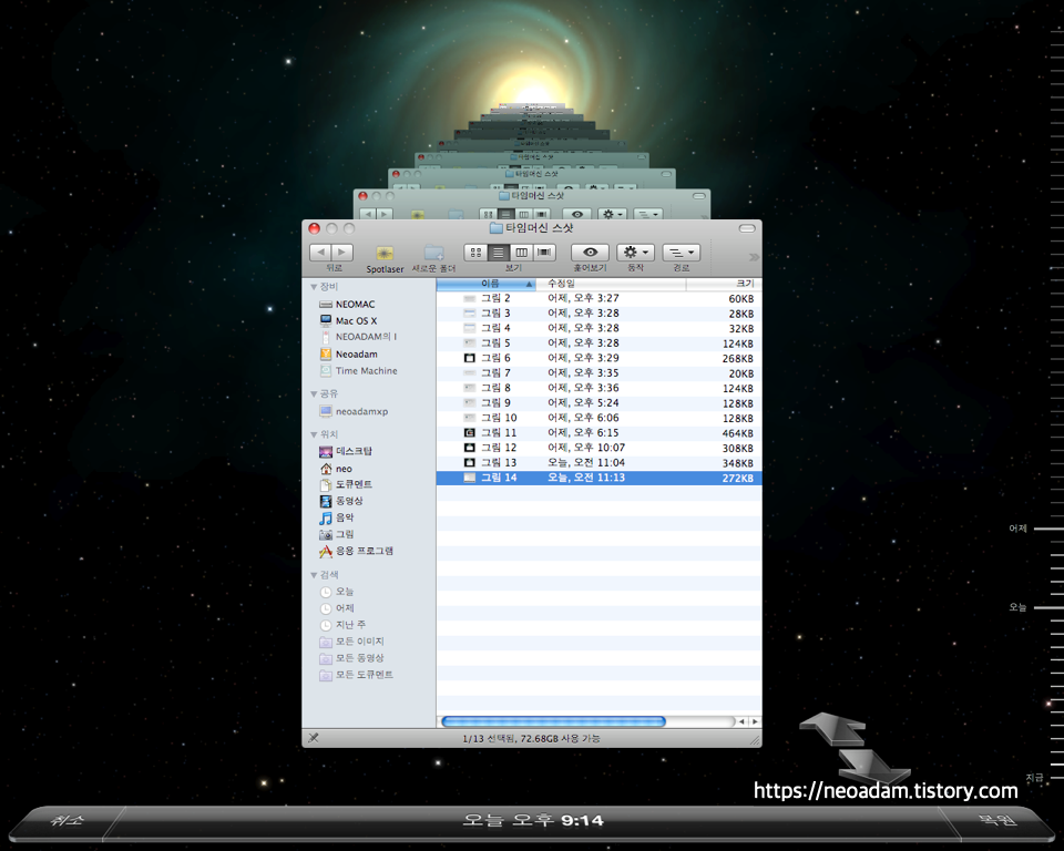 Dock에서 타임머신 아이콘을 클릭합니다. (또는 상태 표시줄에 있는 타임머신 아이콘 클릭 → 타임머신 실행) 실행하면 타임머신으로 전환되면서 파인더들이 줄지어 나타납니다.