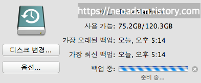 지정하면 타임머신 아이콘으로 바뀝니다. 이렇게 디스크를 지정해주면 백업이 시작됩니다.