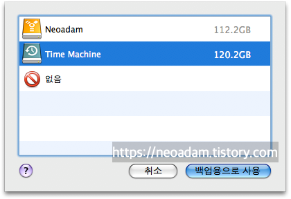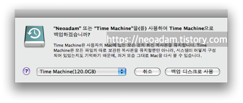 얼마 전 하드디스크를 날려 먹은 뒤 다시 온 빈 하드 디스크를 받아 들고 보니, 그동안 빈 외장 하드디스크가 없어서 이용해 보지 못한 타임머신을 사용해 보고 싶어졌습니다.