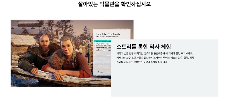 어쌔신 크리드: 디스커버리 투어(Discovery Tour by Assassin's Creed®)는 유비소프트에서 제작한 액션 어드벤쳐(+잠입 액션) 게임인 어쌔신 크리드: 오리진(2017)과 오디세이(2018) 그리고 발할라(2021)에 담긴 역사적 사실과 자료, 그리고 제작진의 코멘터리를 보는 이름 그대로 그 세계를 ‘투어(Tour)’하는 작품입니다. 제작사인 유비소프트에서는 이 타이틀의 소개를 다음과 같이 적고 있습니다.