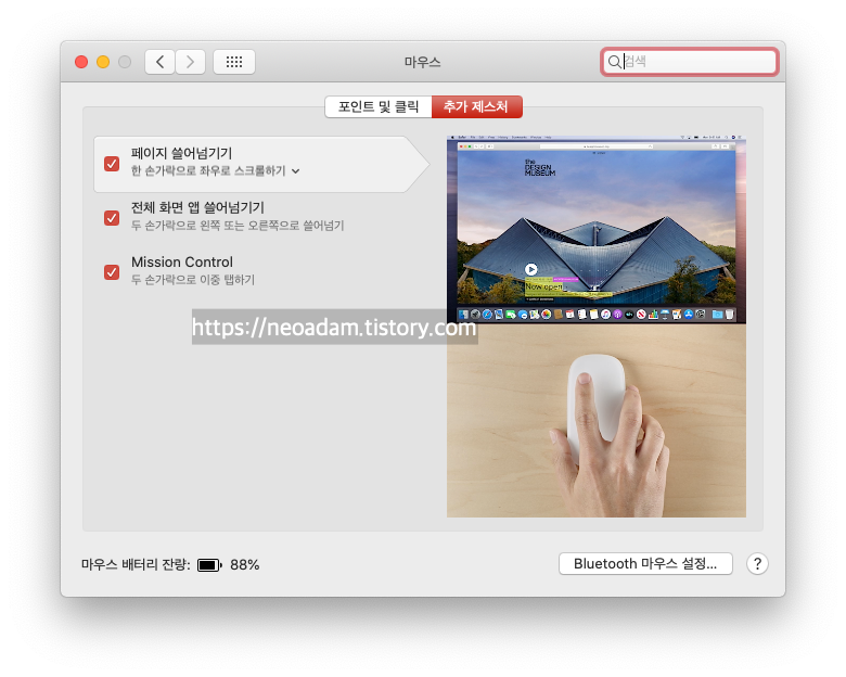 앞서 소개한 추가 설정 프로그램은 처음에 사용하다가 지금은 순정(?)으로만 사용하고 있습니다. 매직 트랙패드도 사용하고 있기 때문에 굳이 좁은 마우스에 추가 제스쳐 설정을 할 필요가 없다고 느꼈기 때문입니다. 하지만 내 스타일에 맞는지 데모 버전 등을 사용해 보고 결정해도 좋을 것입니다.