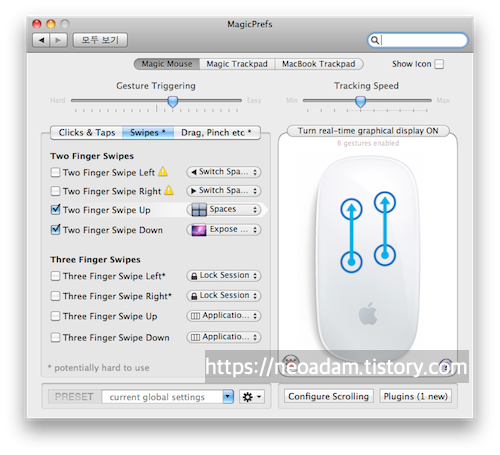 이들 중에서 저는 MagicPrefs를 이용했습니다. 프로그램을 받아 응용프로그램에 설치한 뒤 실행하면 환경설정에 메뉴가 생기고 메뉴에 들어가면 아래와 같은 화면을 볼 수 있습니다. 윗부분은 제스처의 감도를 조절해 주고, 아래 스크린샷에서 볼 수 있듯이 애플의 또 다른 제스처 패드인 ‘매직 트랙패드’와 맥북 계열의 트랙패드의 제스처를 설정해 줄 수 있는 텝이 보입니다.