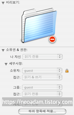 위젯의 세팅은 다시 잡아주면 되지만 폴더들의 접근에 문제가 생긴 경우에는 command+i를 눌러 정보를 연 다음에 아래와 같이 권한 설정을 다시 잡아야 합니다.