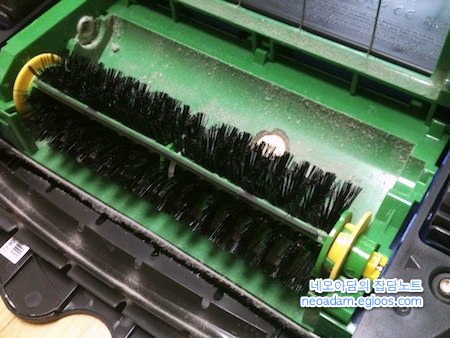 노란 부분은 경칩인데 한쪽으로 움직이면 들어 올려서 안에 있는 브러시류를 뺄 수 있습니다. 위쪽에 있는 은색 단자 두 개는 충전 베이스와 접촉하는 단자입니다.