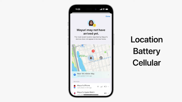 목적지까지 15분 이상 이동하지 않거나 예정된 시간이 다 지나도 이동하지 않으면 체크인에서 괜찮은지 확인함. 응답하지 않으면 현재 위치와 같은 중요 정보를 정해진 사람에게 자동으로 공유함. 또한 배터리 및 휴대폰 상태를 공유하여 전화나 메시지에 응답할 수 있는지 여부를 알 수 있음.