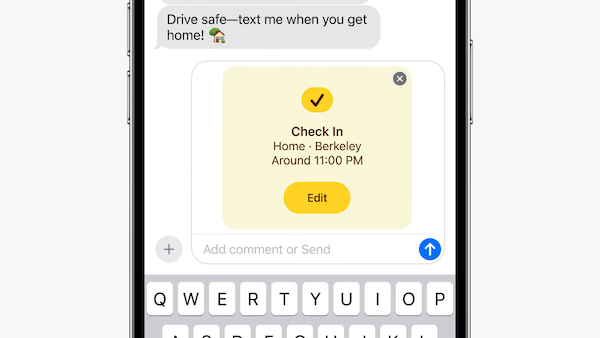 가족이나 친구에게 체크인을 시작하여 목적지에 도착했음을 알릴 수 있음. 체크인은 안전하게 도착했는지 감지하여 자동으로 알릴 수 있음.