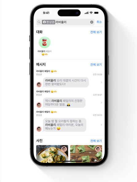 사람, 키워드, 그리고 콘텐츠 유형(사진, 링크) 등 다양한 검색 필터를 조합해 검색 범위를 좁히는 방식으로 원하는 메시지를 더욱 정확하게 찾을 수 있음.