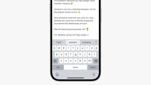 자동 수정 기능이 새 트랜스포머 언어 모델을 활용하여 더 정확하게 오타를 수정함. 지원 기종: iPhone 12와 그 이상. 지원 언어: 영어, 프랑스어, 스페인어
