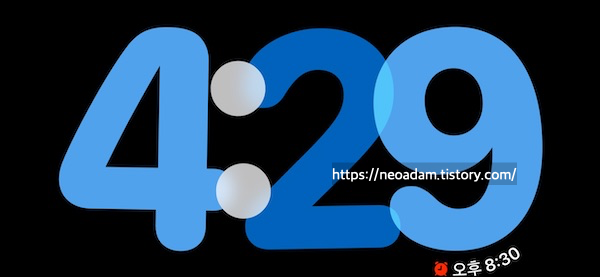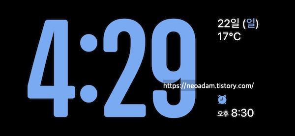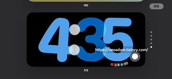 기본 시계 스타일은 ‘유영’이며 화면을 꾹 눌러 선택 메뉴에서 시계 스타일 다섯 개 중에서 고를 수 있음.