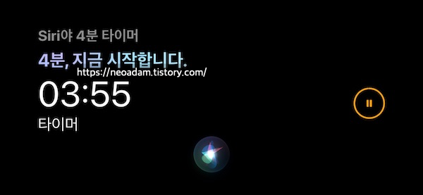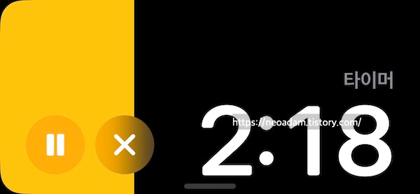 아래 스샷은 타이머 두 개를 실행한 모습. 화면 위 가운데 있는 타이머 표시를 탭 하면 다른 타이머가 나타남.