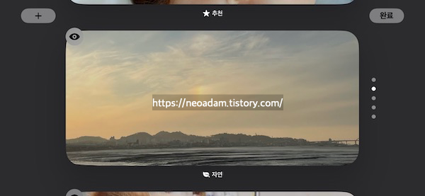 다른 위젯 설정처럼 화면을 꾹 누르면 추천(랜덤 재생), 자연, 반려동물, 도시, 사람들에서 선택할 수 있음. 눈 아이콘을 눌러 끄고 켤 수 있음. 설정에 들어갈 때는 보안 때문에 페이스 아이디 인식(또는 비밀번호 입력)을 거침.