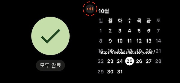 음악을 재생하고 있을 때도 마찬가지. 음악은 바로 보이지 않고 기존 위젯 화면 위에 음악 재생 아이콘(점선 원)이 뜨고 이 아이콘을 누르면 재생창으로 바뀜.