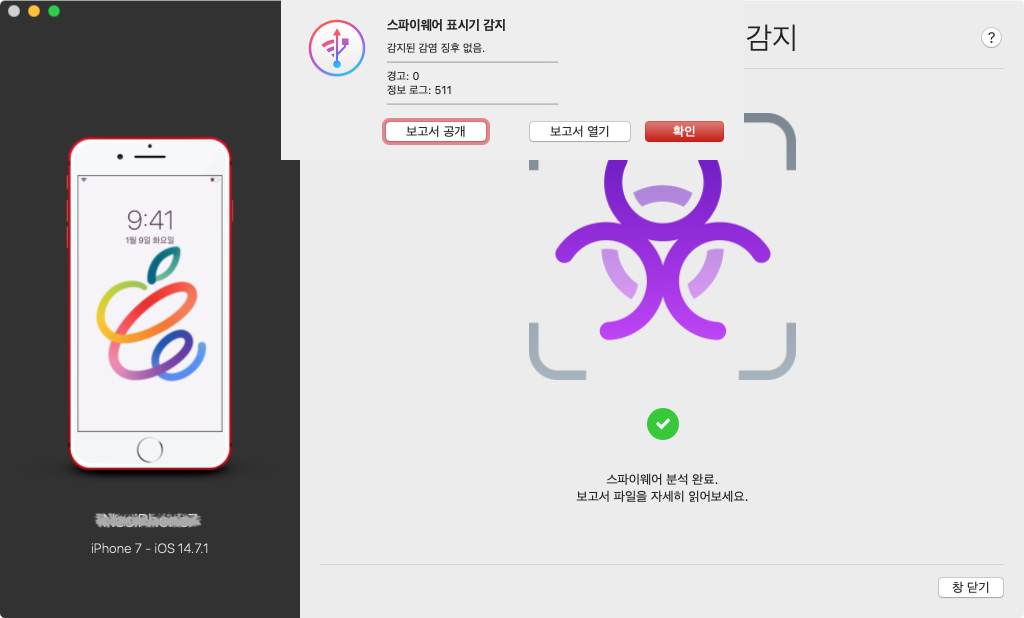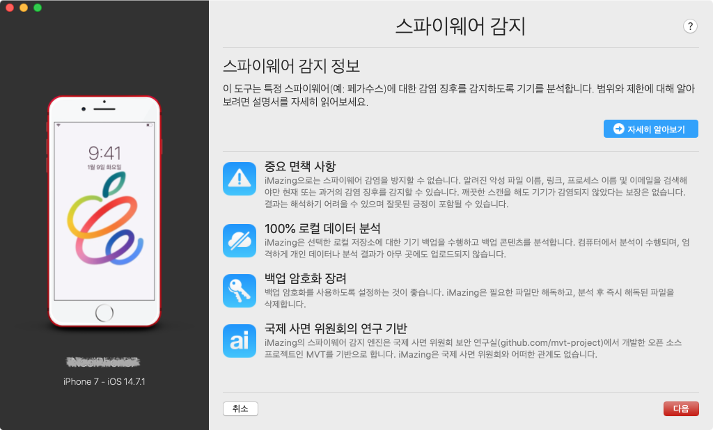 이 iMazing에서 제공하는 스파이웨어 감지 도구는 앞에서 말한 MVT를 이용해서 페가수스 감염 여부를 쉽게 확인할 수 있게 도와줍니다.
