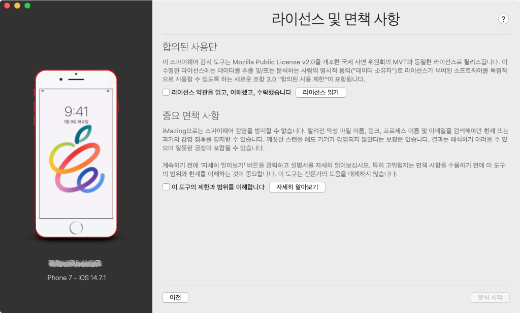 보안 문제를 확인하는 것이라 그런지 중요 고지 사항에 ‘iMazing이 스파이웨어 감염을 예방할 수 없고 현재나 과거 감염 징후만 감지할 수 있다. 클린 스캔은 장치가 감염되지 않았음을 보장하지 않는다. 결과를 해석하기 어려울 수 있으며 잘못 탐지할 수도 있다. 여러 제한 사항이 있으니 알고 있으라.’ 는 등 주의사항을 안내하고 라이센스와 면책 조항에 동의해야 검사를 시작할 수 있습니다.
