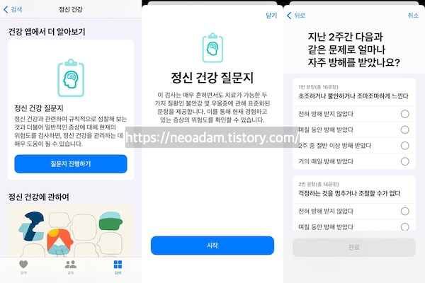 건강앱 → 검색 → 정신 건강 → 건강 앱에서 더 알아보기: 정신 건강 질문지 → 질문지 진행하기
