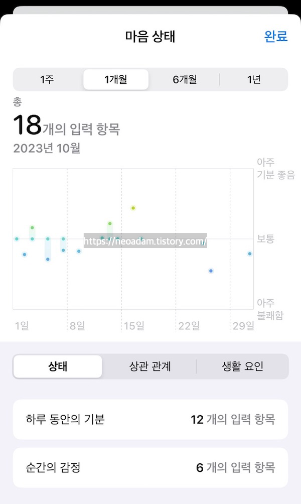 감정의 원인이 되는 요소와 같은 주요 사항을 확인할 수 있음. 운동, 수면, 낮 시간, 마음챙김 시간 등 기분에 영향을 줄 수 있는 라이프스타일 요소와 함께 기분과 감정을 확인할 수 있음.