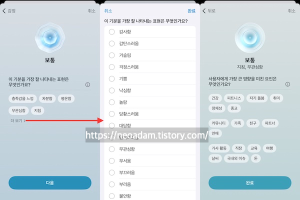건강 앱에서 가장 큰 영향을 주는 것을 선택하고 감정을 설명하여 순간적인 감정과 일상적인 기분을 기록할 수 있음. 이는 감정 인식을 높이고, 내성을 키우며, 삶의 질을 높이는 데 도움이 될 수 있음.