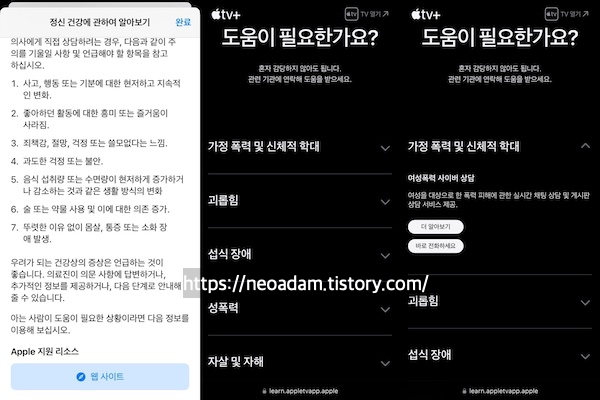 건강앱 → 검색 → 정신 건강 → 정신 건강에 관하여: 정신 건강 질문지 메뉴 속 맨 아래 Apple 지원 리소스 웹 사이트