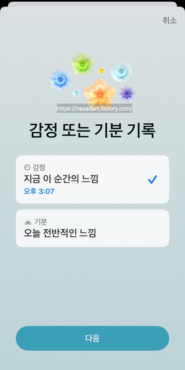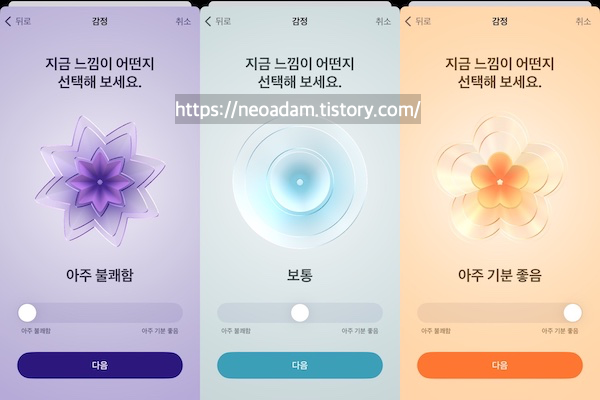 건강 앱에서 가장 큰 영향을 주는 것을 선택하고 감정을 설명하여 순간적인 감정과 일상적인 기분을 기록할 수 있음. 이는 감정 인식을 높이고, 내성을 키우며, 삶의 질을 높이는 데 도움이 될 수 있음.