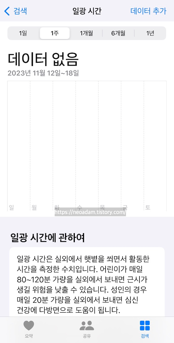 건강앱 → 검색 → 기타 데이터 → 일광 시간