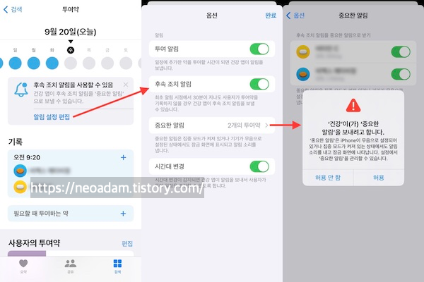이 알림을 중요 알림으로 설정하는 옵션도 있음. 건강 앱 → 투여약 → 옵션