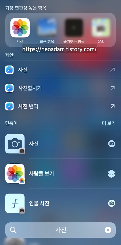 예를 들어 '사진'을 검색하면 즐겨찾기, 사람들, 최근 항목 등 앨범으로 바로 이동할 수 있음.