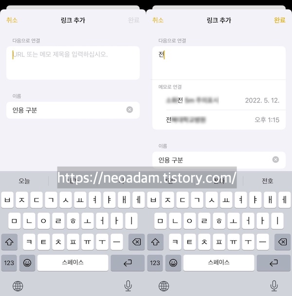 링크를 넣을 범위를 선택하고 팝업 메뉴에서 링크 추가를 눌러 URL 또는 메모 제목을 넣을 수 있음.