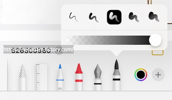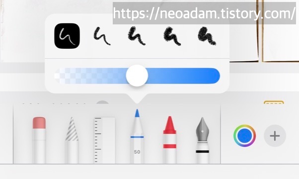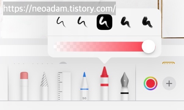 사진과 PDF에 더 많은 마크업 도구 사용 가능: 자 오른쪽에 고정 폭 펜, 크레용, 캘리그래피 펜, 붓 추가