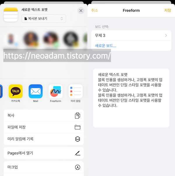 공유 시트로 다른 앱의 콘텐츠를 Freeform 보드에 추가할 수 있음.