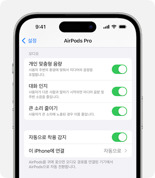 지원 기종: 최신 펌웨어가 설치된 iPhone XS, iPhone XR 이상 및 AirPods Pro(2세대)