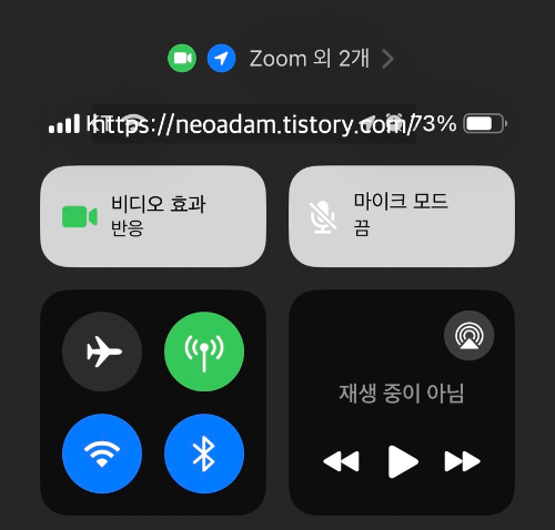 방법: 화상회의 앱을 열고 (화면 오른쪽 위에서 아래로 스와이프하여) 제어센터를 열면 페이스타임처럼 효과 제어창이 보임.