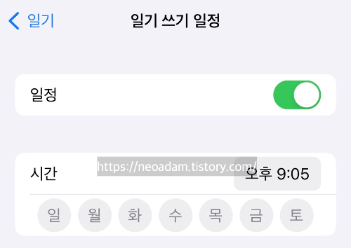 일정 설정으로 원하는 요일과 시간(하루 시작 또는 끝)에 일기 쓰기 알림을 정할 수 있음.