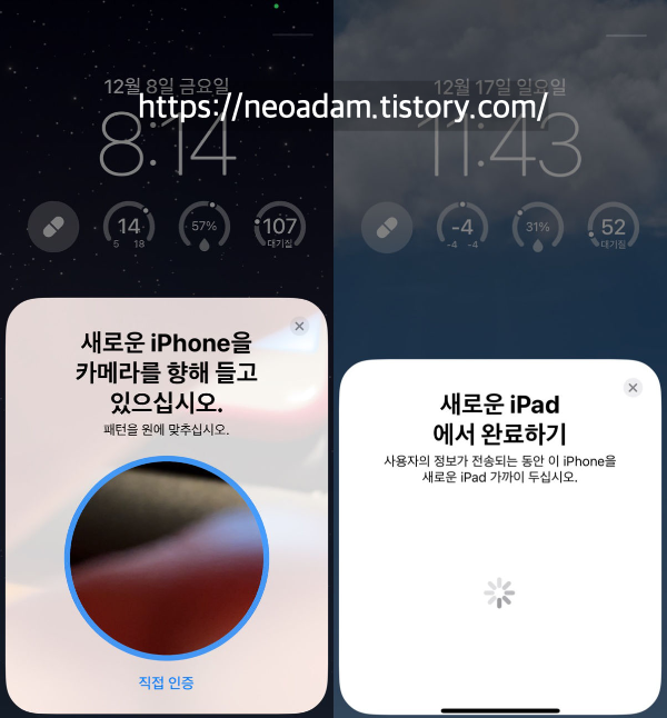 기기 설정 도중 로그인할 때 기존에 로그인되어 있고 신뢰할 수 있는 iPhone이나 iPad를 가까이 가져와서 입자(입자 구름) 식별 코드를 스캔하여 페어링하면 새 기기에 자동으로 로그할 수 있음.