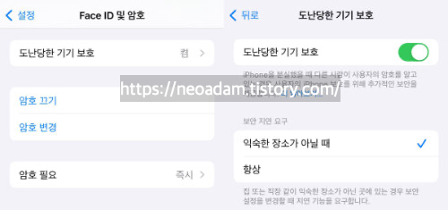 도난당한 기기 보호 기능을 켜면 민감한 보안 변경 작업을 할 때 생체 인증(Face ID나 Touch ID)로 인증을 해도 1시간 동안 기다린 다음 생체 인증을 추가로 완료해야 함.