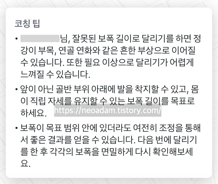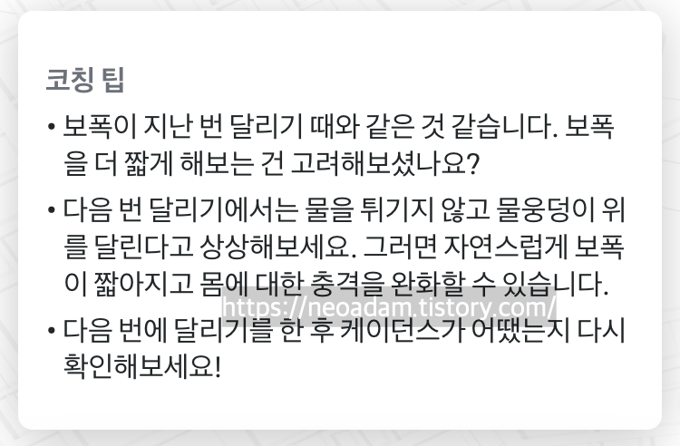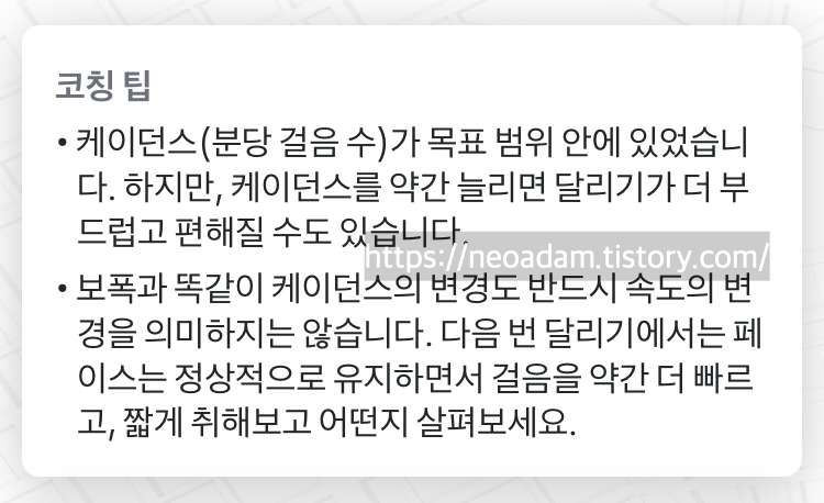 이런 조언을 듣고 케이던스를 조절하거나 자세를 조절하면서 달리면 됩니다.