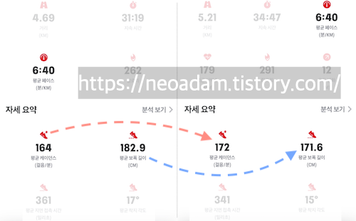 평균 보폭 길이: 182.9 → 171.7 ㎝, 평균 케이던스: 164 → 172 ㎝