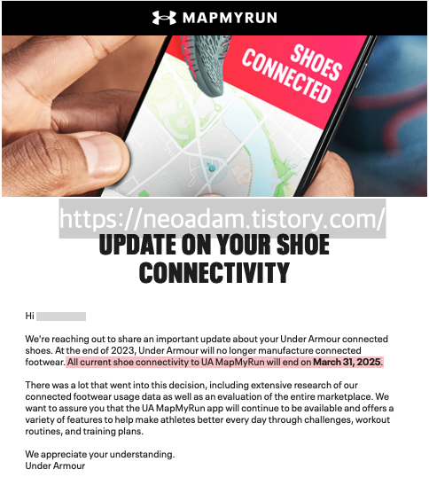 안타깝게도 얼마 전 언더 아머는 사용자에게 커넥티드 슈즈의 생산과 서비스를 종료하겠다는 공지를 보냈습니다.