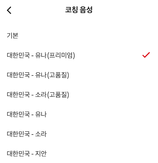 오디오로 코칭을 받을지 켜기/끄기, 오디오 코칭의 빈도(가끔/권장 빈도/자주)를 조절합니다.